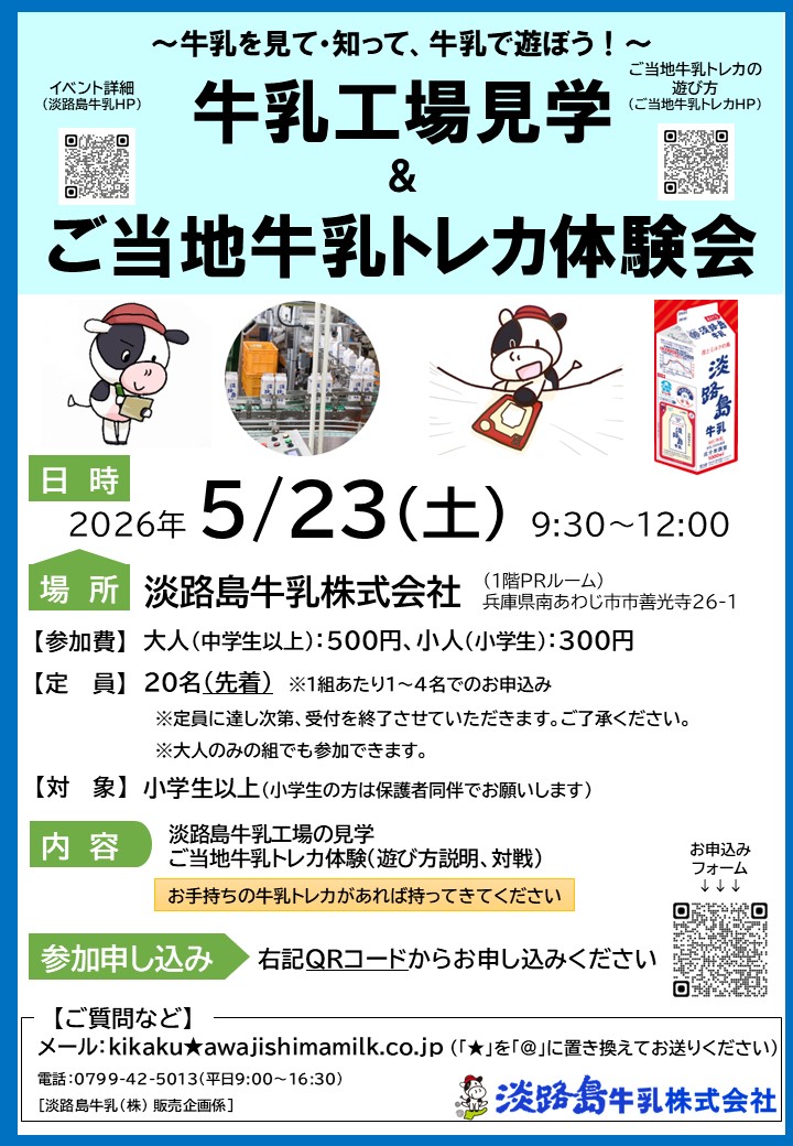2026年5月23日(土)に、淡路島牛乳株式会社(牛乳工場)にて「牛乳工場見学&ご当地牛乳トレカ体験会」を開催いたします!